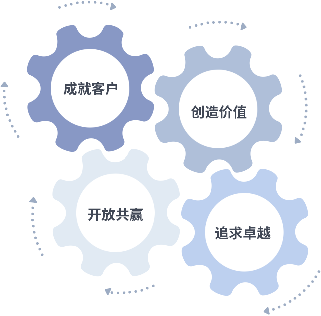 成就客户是一切决策的出发点,创造价值是衡量所有工作的标准,追求卓越是足球外围前十平台做事做人的态度,开放共赢是足球外围前十平台的格局也是最终的结果。价值观的齿轮环环相扣,推动着组织里的每个人不断向前。